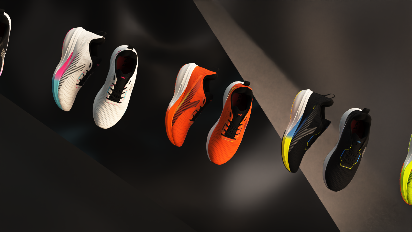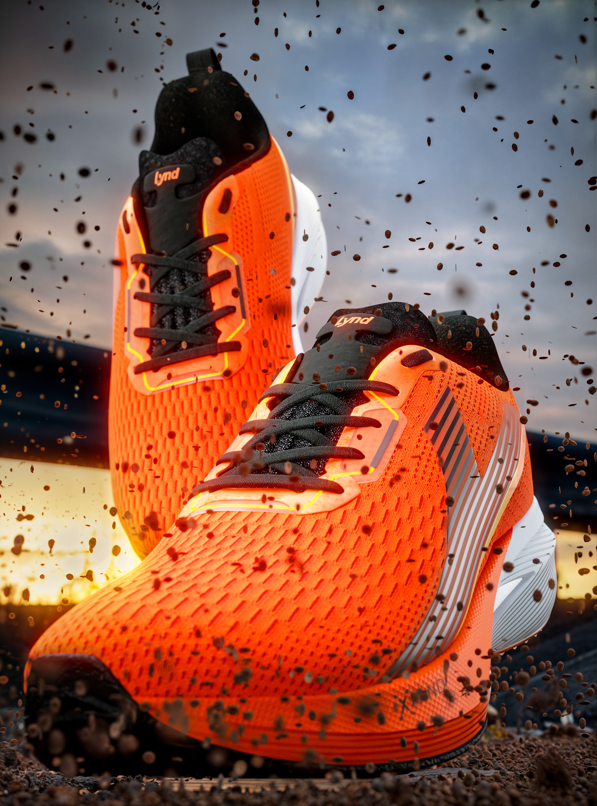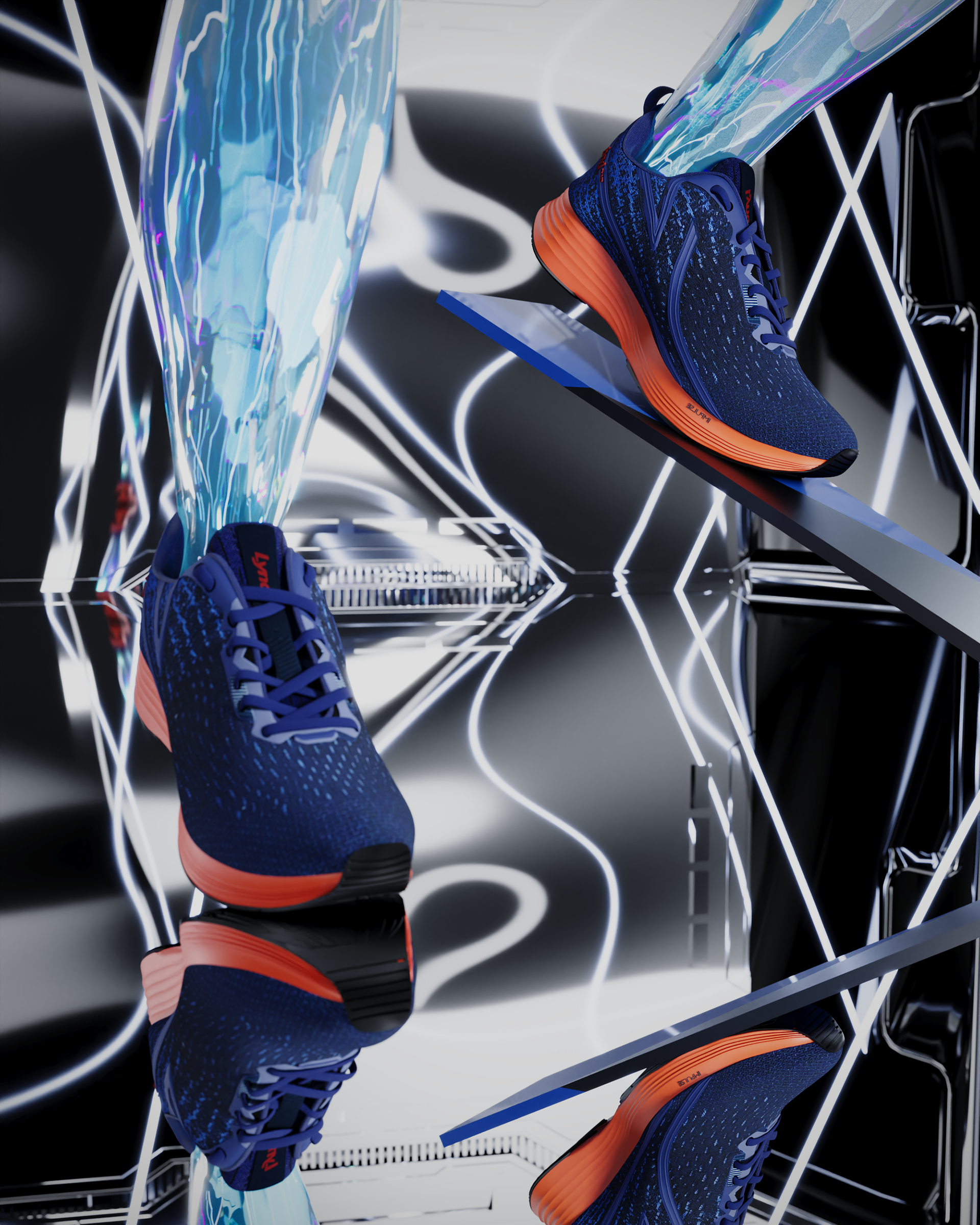 For this launch, our central concept was "Kinetic Fluidity." We wanted the viewer to feel the run even before putting on the shoes. We moved away from traditional running locations and created a visual universe focused on the architecture of movement. We used light as a key narrative element: dynamic beams of light that "scan" the shoe's technology, revealing upper textures and sole details, simulating the energy generated with each stride. The color palette was designed to create contrast between the urban/nighttime environment and the vibrant colors of the new LYND models, ensuring that the product was always the star of the show.