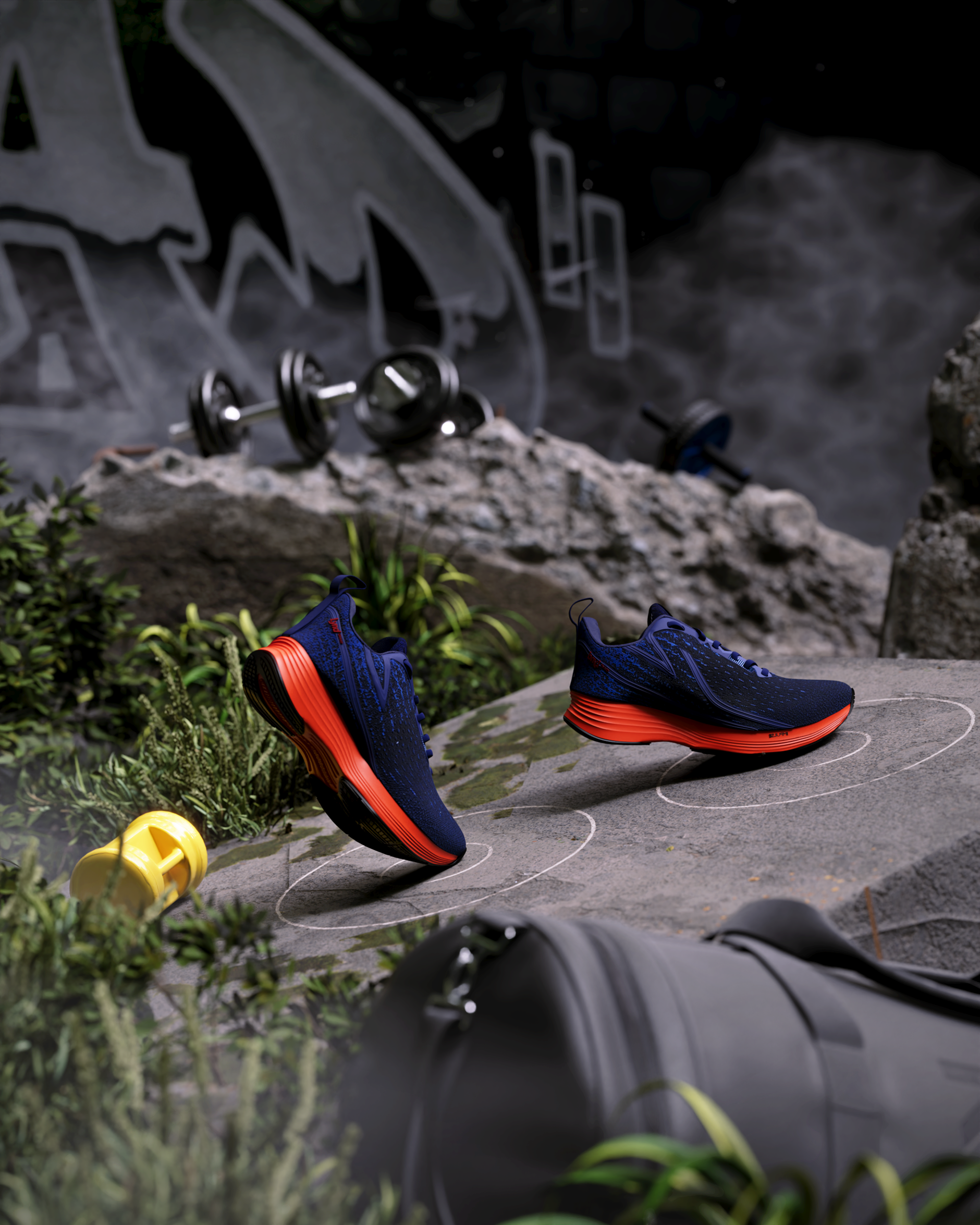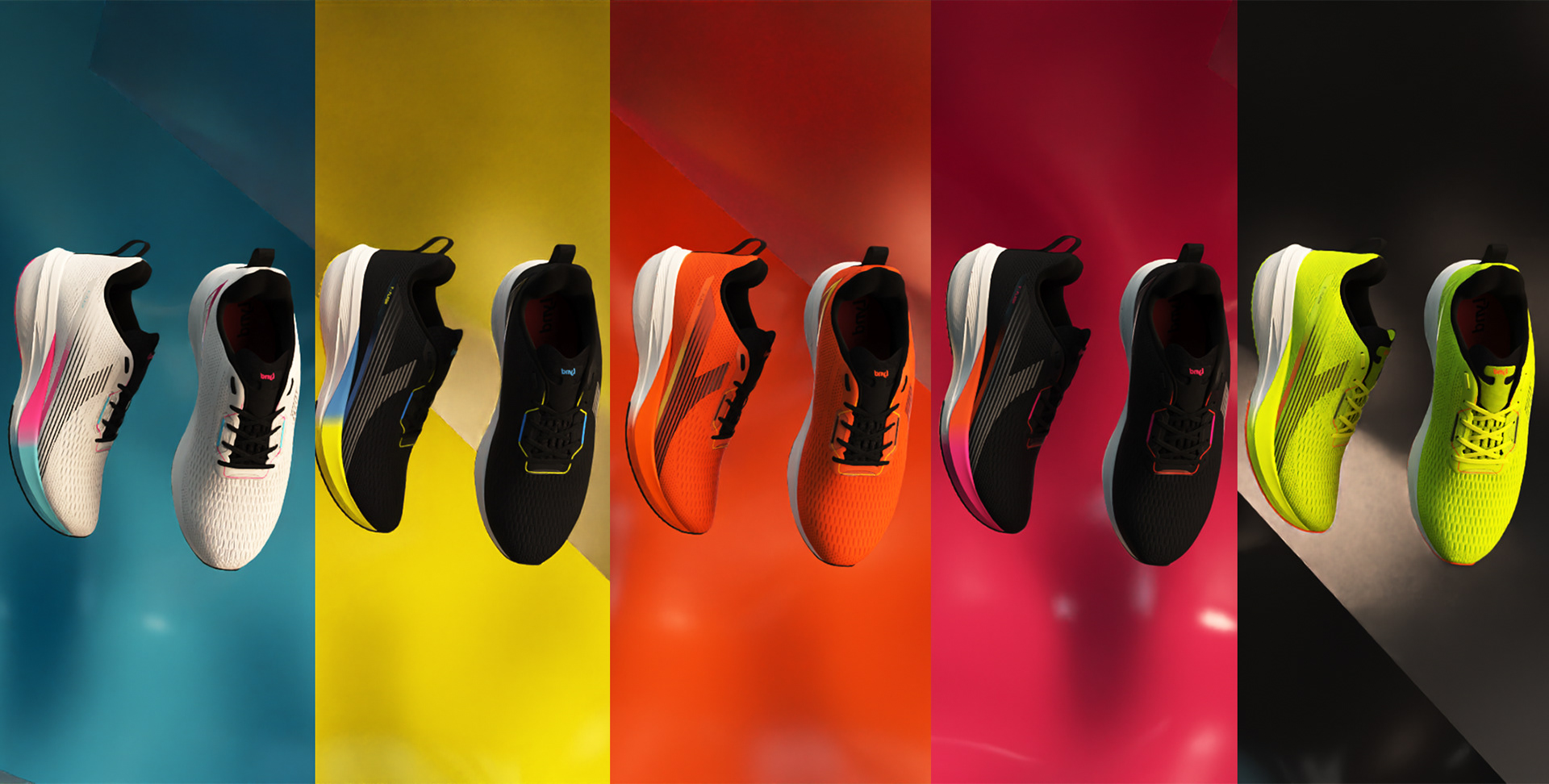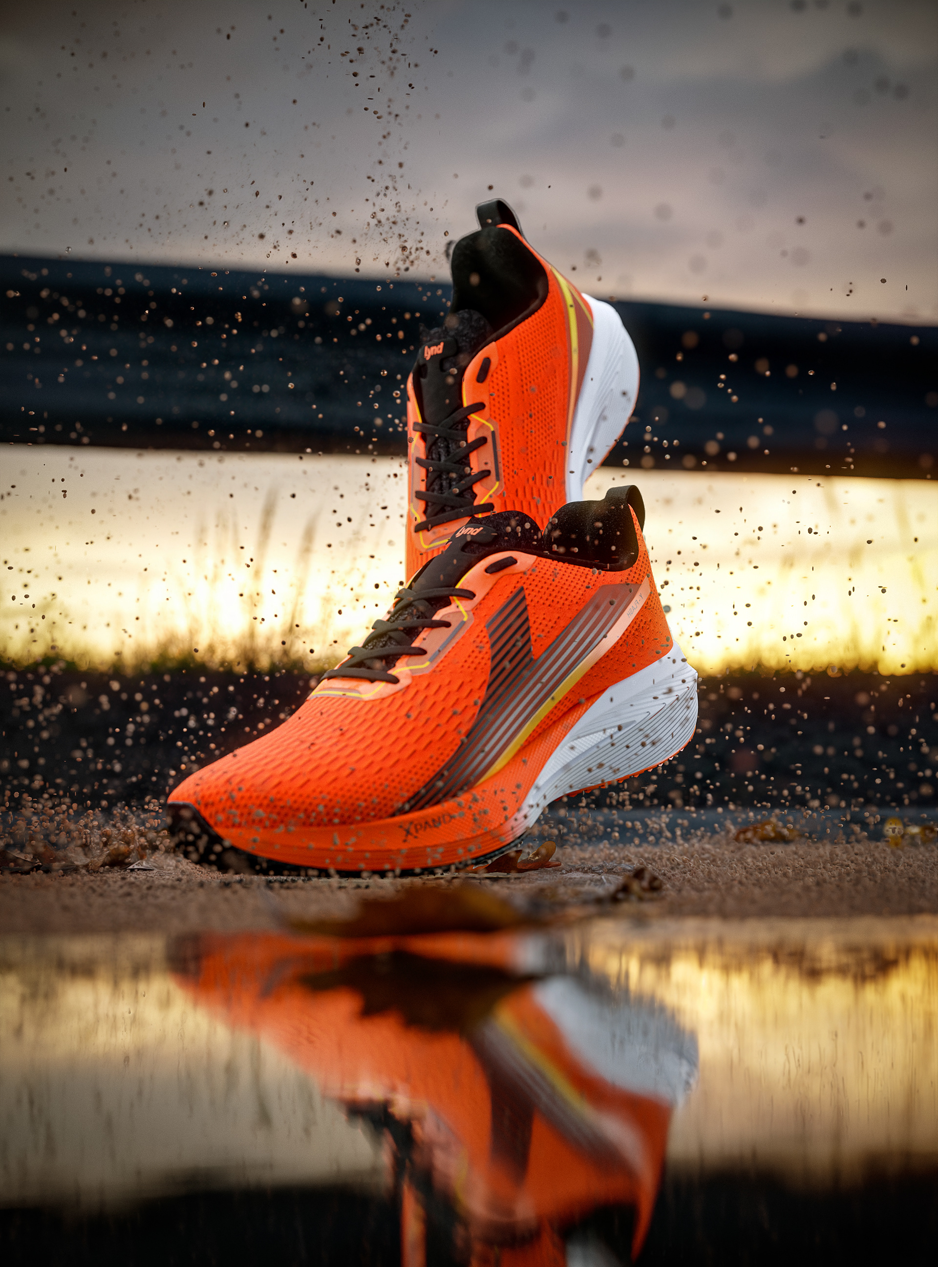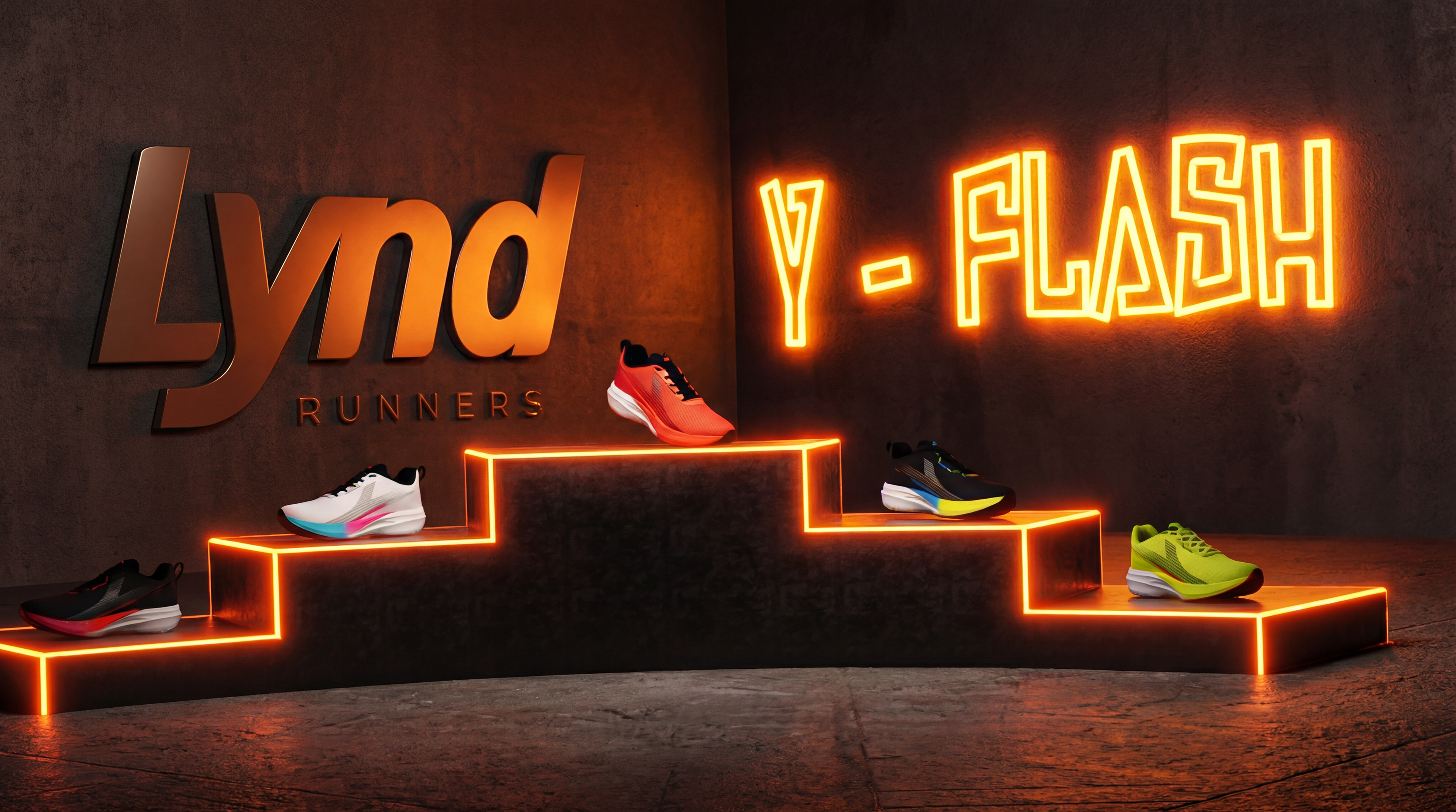 For this launch, our central concept was "Kinetic Fluidity." We wanted the viewer to feel the run even before putting on the shoes. We moved away from traditional running locations and created a visual universe focused on the architecture of movement. We used light as a key narrative element: dynamic beams of light that "scan" the shoe's technology, revealing upper textures and sole details, simulating the energy generated with each stride. The color palette was designed to create contrast between the urban/nighttime environment and the vibrant colors of the new LYND models, ensuring that the product was always the star of the show.
